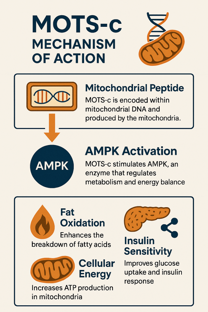 MOTS-c is a 16-amino acid mitochondrial-derived peptide that regulates cellular energy metabolism through AMPK pathway activation. AMPK pathway activation (defined as Adenosine Monophosphate-Activated Protein Kinase) is basically when cells monitor their own energy status. Once activated, AMPK initiates a metabolic shift, promoting energy generation and halting energy consumption. It influences carbohydrate, fat, and protein metabolism throughout the body. The overall function of MOTS-C is to enhance glucose uptake, fat oxidation, mitochondrial biogenesis, and cellular stress resilience. The result? Enhanced fat burning, improved insulin sensitivity, and greater energy efficiency throughout the body!
