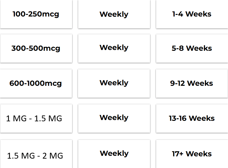 Weekly subcutaneous dosing with gradual titration is the standard protocol similar to all of the GLPs. Dosing depends on the individual, but most dosage recommendations prefer to start small at 100-250 mcg per week for the first four weeks and then titrate up from there. See chart below for additional recommendations: